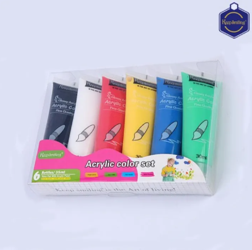 Product details of Acrylic Colour 6 Colors 30ml Professional Acrylic Paint Set Keep-Smiling ACRYLIC SET OF 6 PROESSIONAL USE 30 ML TUBE Non-toxic, dries quickly and long lasting vibrant. Wide range of surfaces, such as canvas, ceramic, wood, clay, walls, nails, crafts and more.