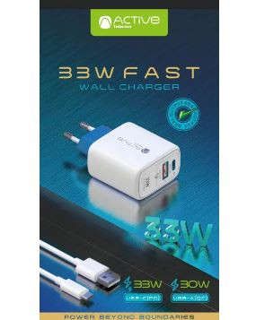 Product Details of Active Telecom 33 WFAST Wall Charger With 1m. type-c cable Specification : Input :Ac180-240V~50/60Hz.1AMax Output : USB A :5V_3A.9V-3A.12V-2.5A Output: USB C:5V-3A.9V-3A.12V-2.5A.15V-2A.20V-1.65A Concurrent Output:5V_4A
