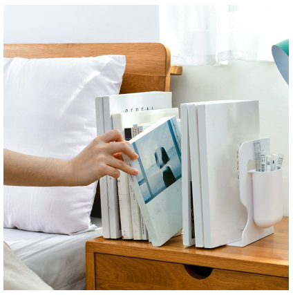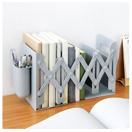 Innovative Design --- One-piece structure and adjustable feature bookends, has a maxium length of 49cm and mininum 21.5cm. You can freely adjust the length of the bookends according to the thickness and quantity of your books or folders. With pen case hanging, easy to store pens, rulers, etc.