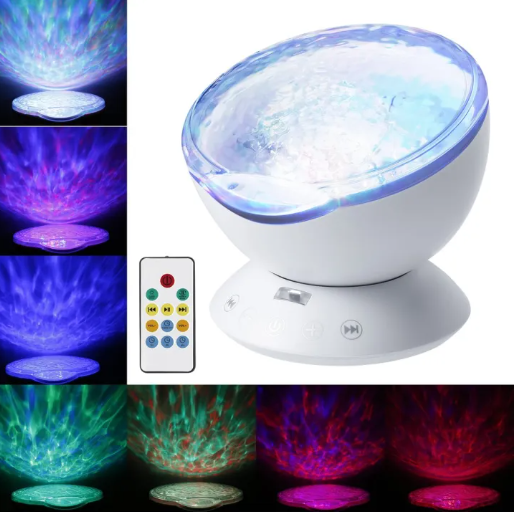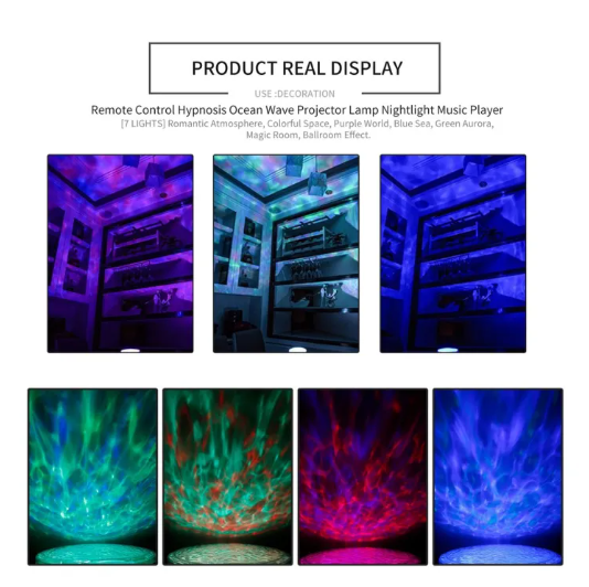 Product Details of Cimiva Remote Control Hypnosis Ocean Wave Projector Lamp Nightlight Music Player [4 SOUNDS] Insects Chirping in the Forest, Seagulls Crying over the Ocean Waves, Birds Singing with Water Flowing, Lively Natural Sounds. [7 LIGHTS] Romantic Atmosphere, Colorful Space, Purple World, Blue Sea, Green Aurora, Magic Room, Ballroom Effect. [EASY TO USE] Turn on the bottom switch and LONG press the power button for 3 seconds to turn the light on. SHORT press the power button to switch among 7 light modes. Change musics via buttons or remote control. Long press the power button to turn it off. [REMOTE CONTROL] You could remotely turn on/off the projector, control the rotation, change among 7 light modes and 4 musics, volume up/down, set timer of 1/2/4 hours. Powered by 2 AAA batteries(NOT INCLUDED) [EXTERNAL MUSIC] Supports TF card as well as 3.5mm aux-in music input, which allows you to play music from cellphone, tablet or PC. 100% product satisfaction guaranteed, 30-day money back, 24/7 support, 1-year warranty. Features: [4 SOUNDS] Insects Chirping in the Forest, Seagulls Crying over the Ocean Waves, Birds Singing with Water Flowing, Lively Natural Sounds. [7 LIGHTS] Romantic Atmosphere, Colorful Space, Purple World, Blue Sea, Green Aurora, Magic Room, Ballroom Effect. [EASY TO USE] Turn on the bottom switch and LONG press the power button for 3 seconds to turn the light on. SHORT press the power button to switch among 7 light modes. Change musics via buttons or remote control. Long press the power button to turn it off. [REMOTE CONTROL] You could remotely turn on/off the projector, control the rotation, change among 7 light modes and 4 musics, volume up/down, set timer of 1/2/4 hours. Powered by 2 AAA batteries(NOT INCLUDED) [EXTERNAL MUSIC] Supports TF card as well as 3.5mm aux-in music input, which allows you to play music from cellphone, tablet or PC. 100% product satisfaction guaranteed, 30-day money back, 24/7 support, 1-year warranty. Description: ★4 Sounds ★7 Lights ★Rotatable Projection ★Remote Control ★Timer Setting ★External Music Sources(TF Card/3.5mm Aux) Input: DC5V/1A Speaker: 4Ω/3W Rated Power: 2W Power: 160hz-20khz Motor: 5V 13 Circle Material: ABS/PS/Metal/Electronic Components USB Cable: 3.3ft (1.2m) Audio Cable: 2ft (0.6m) Color: black, white Size:125 x 125 x 100mm Remote Control 1. Power button to turn on/off. 2. Change light modes. 3. Control rotation angle. 4. Play previous/next song or stop playing. 5. Volume up/down. 6. Set timer of 1/2/4 hours.