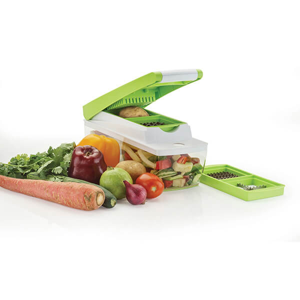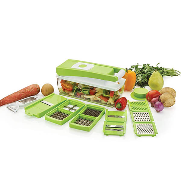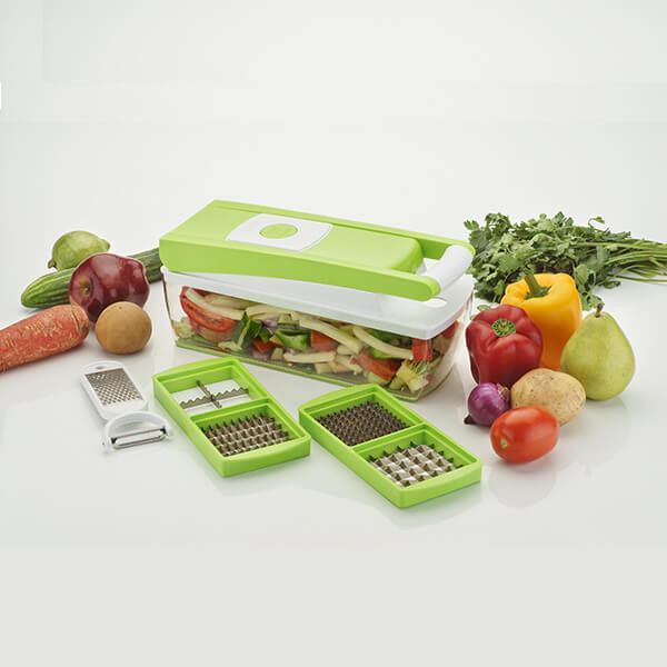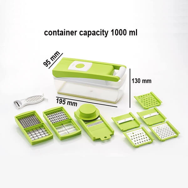 Fastest, safest and easiest way to chop or dice fruits and vegetables High-quality stainless animate blades for accessible chopping, Sharp pyramid-shaped acid brand for able and bland cutting Package Contents: 1 Plastic Container, 1 peeler with grater, 1 assurance holder, 1 masher & 1 handle with charwoman press Blades: 1 dual, 2 slicer, 2 grater, 1 Juliane, brand die attachment