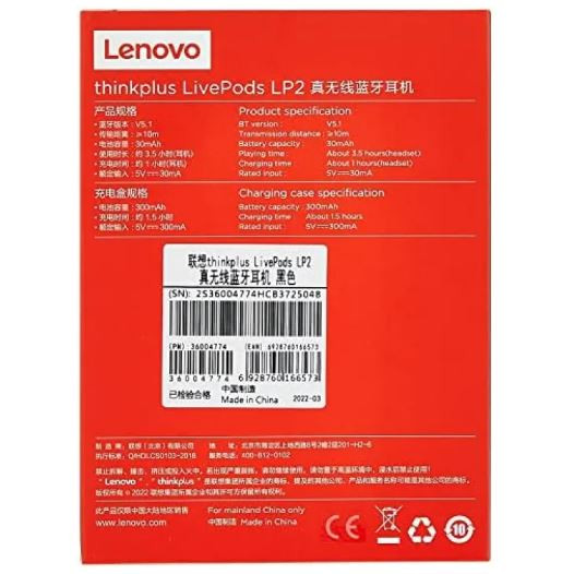 Specification of Lenovo Think plus LP2 TWS Wireless Bluetooth Earbuds Brand-Lenovo SKU-231217EA648 What's in Box-Only Wireless