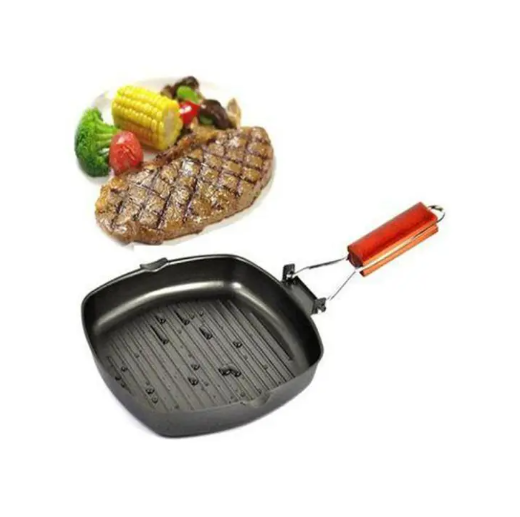 Product Details of Non-Stick Ceramic Titanium Grill Pan - Black Color: Black Grill pan Ideal for home kitchen or café Material: Carbon coated steel Gives avant-garde attending to your kitchen Easily washable Lightweight, Non-stick Wooden handle