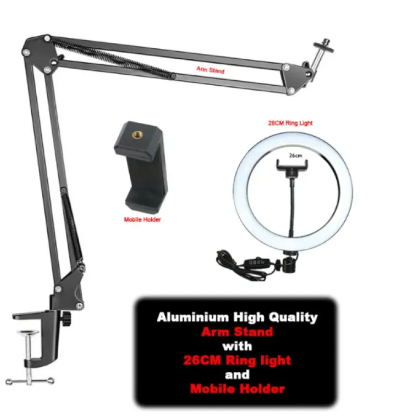 Product Details of Overhead Video Stand with 10 inch Ring Light and Phone Mount for Drawing, Cooking Video, Facebook, YouTube Live Streaming Table Arm Angle for Overhead Video Angle with 10'' Ring light Adjustable Height and movement Made with Metal Stand Size (Approximately): 14’’ X 14'' Overhead Buzz Video Angle Buzz abeyance angle scissor arm comes with buzz blow and brawl arch camera arise applicable able-bodied corpuscle phone, video, alive stream, baking, crafting and added accessories with 1/4 threading hole.