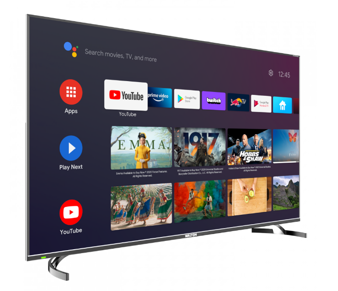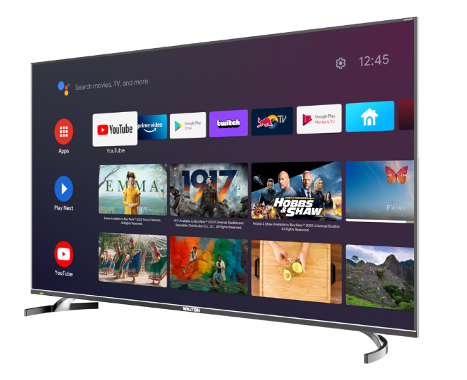 Features Technical Specifications Picture Gallery Supports 360º View Basic Information : Brand Walton Model WE55RUG1 Country of manufacturer Bangladesh Product Type LED UHD Smart TV Display Resolution 3840 X 2160 CPU ARM CA55 Quad Core GPU Mali-470 CPU Frequency1.2 GHz GPU Frequency470 MHz DDR RAM Size 1.5GB eMMC Flash8 GB Screen Size 1.397m Operating System Android 9.0 TV SystemPAL; NTSC ; SECAM Receiving Range 48.25 MHz - 863.25 MHz No of Channel (ATV) 99 Power Supply AC 110V-240V 50/60Hz Power Consumption (TV On 200W Power Consumption (Standby ≤0.5W Audio Dolby Digital Plus Certification HDMI, Dolby, ERP ECO Energy efficiency Yes Internet LinkWireless Wi-Fi Default LED Indicator StatusRED in Standby Panel Specification : Backlight Unit LED Panel Active Size (meter) 1.397 Brightness310 ± 10 cd/m2 (typical) Contrast Ratio 1300:1 (typical) Response Time8ms Viewing Angle (H/V) 178°/178° Life Time (Type) 30,000hrs Color 16.7M Basic Function Sleep TimerYes Wi-Fi Yes Bluetooth Yes HDR Yes HDMI CEC/ARC Yes Picture : Picture Mode Standard\Dynamic\Natural\Movie\Personal Screen Mode 16:9,4:3 Noise Reduction Low\Middle\High\Auto\Off Dynamic Contrast Yes Application List: Google Play Store Yes Screen SharingYes, default on, [Wi-Fi direct] Chromecast Built-inYes PC Compatibility Yes